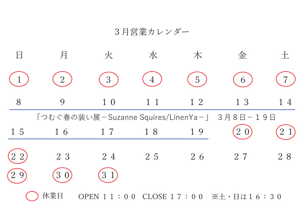 「 ao 冬のガーゼ展 」 12.13( 土 )-12.21( 土 ) open11:00 close17:30 土日16:30 ※期間中無休 つむぐ年内最後の企画展は「ao」さんの冬のガーゼ服をご紹介[…]